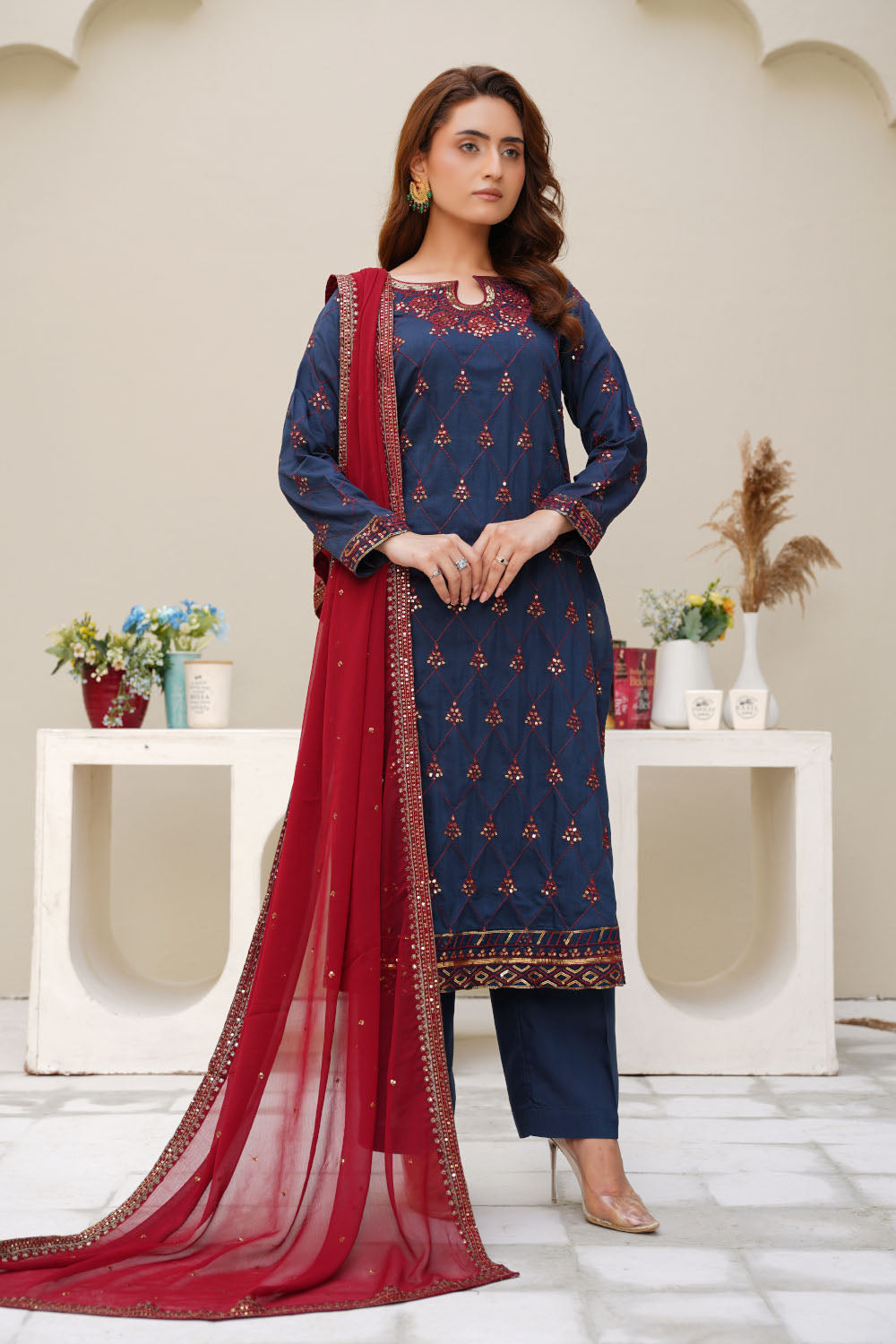 3 Piece seqiun embroidered viscose Suit (Shirt+Dupatta+Trouser) Sequin embroidered neckline of shirt. Embroidered velvet Daman...